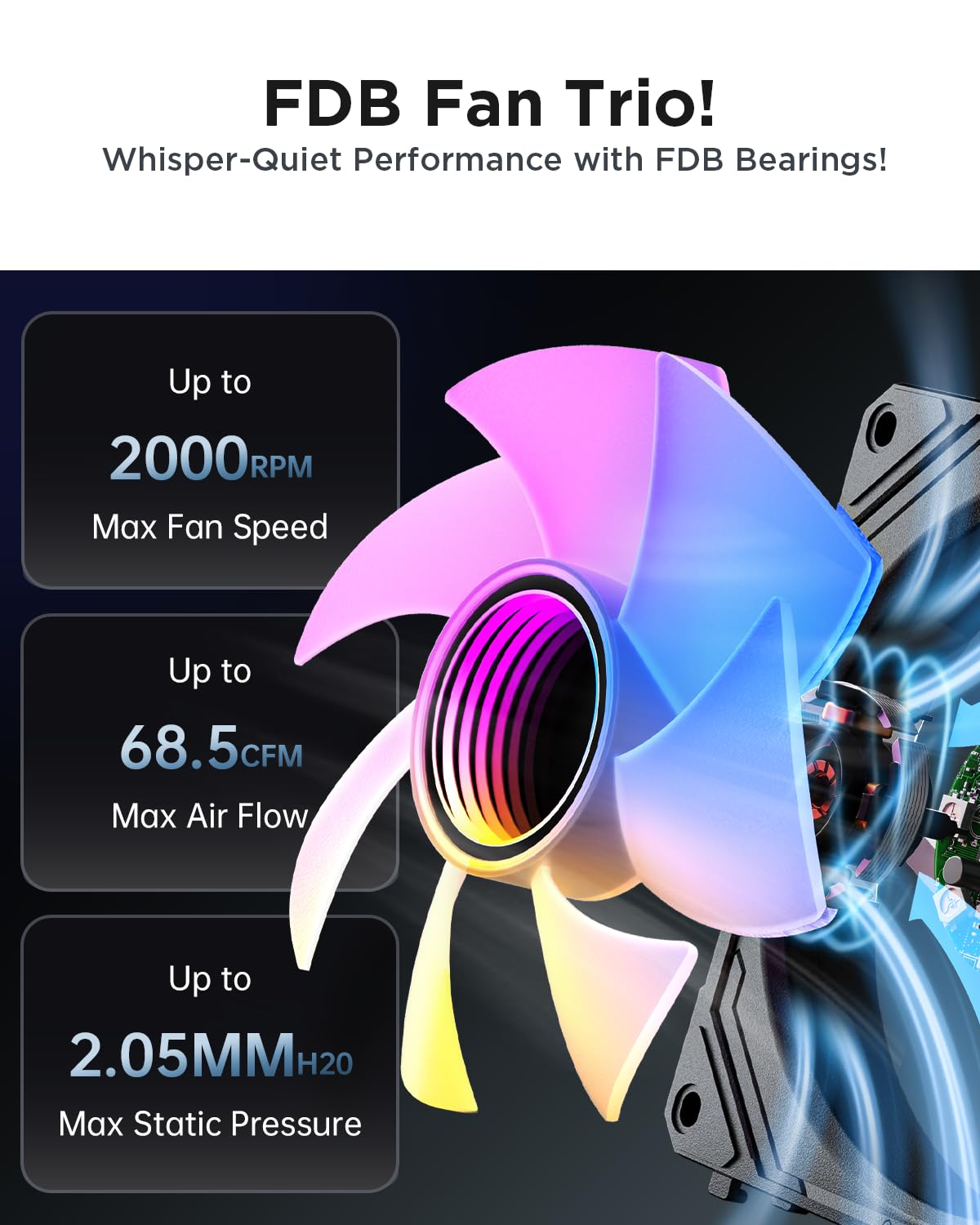 - Mantenga su sistema fresco: Cada ventilador de PC está diseñado con control PWM, la velocidad del ventilador se puede ajustar manualmente a través del software. Soporta hasta 2000 RPM y 68.5CFM de flujo de aire por ventilador, proporcionando mucha presión de aire para mantener el sistema fresco.