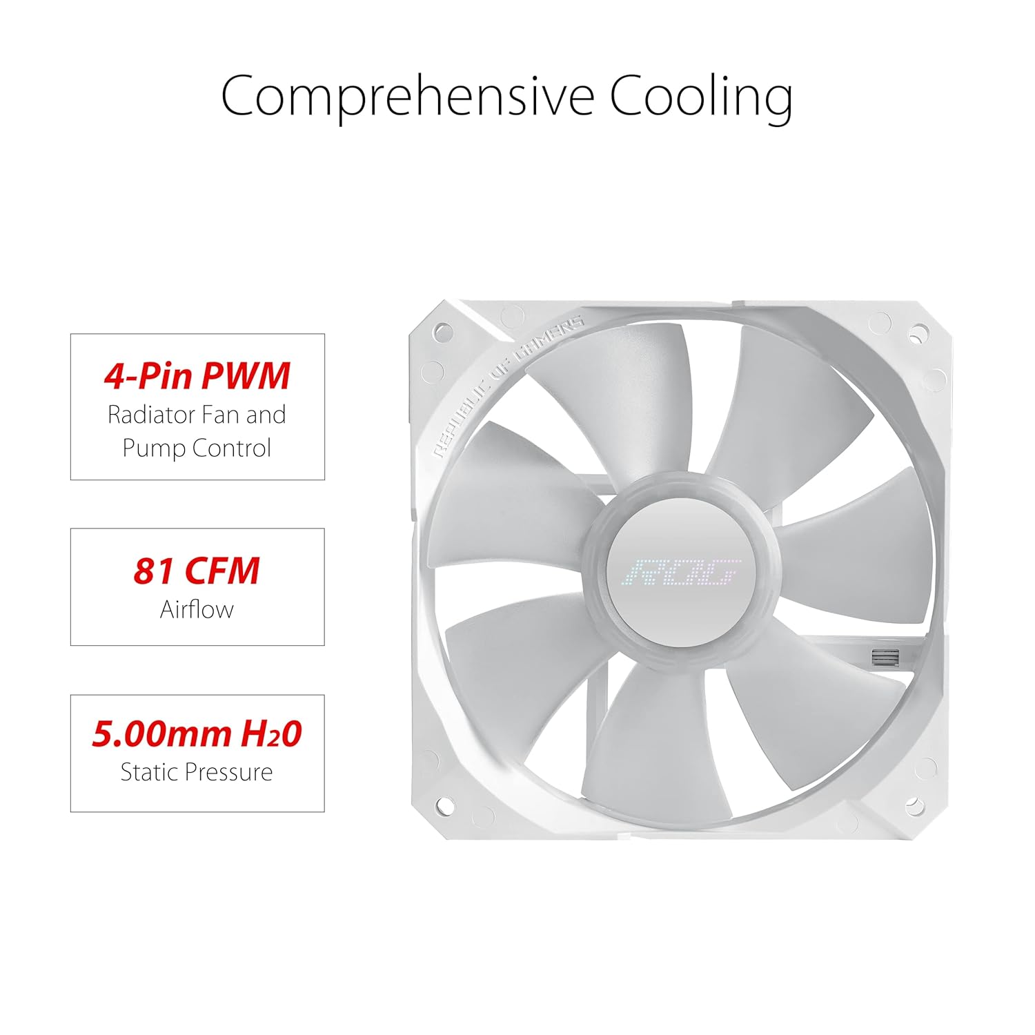 - Ventiladores de radiador ARGB diseñados por ROG para un flujo de aire optimizado y presión estática