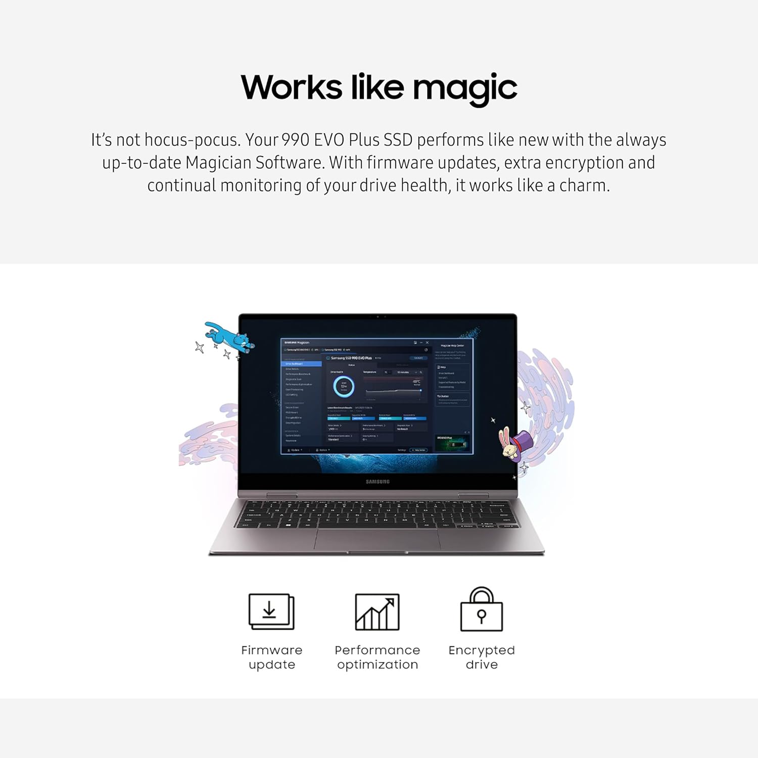 - NUNCA TE PIERDAS UNA ACTUALIZACIÓN: Tu SSD 990 EVO Plus funciona como nuevo con el siempre actualizado Magician Software. Manténgase al día con las últimas actualizaciones de firmware, cifrado adicional y monitoreo continuo del estado de su unidad: funciona como un encanto.